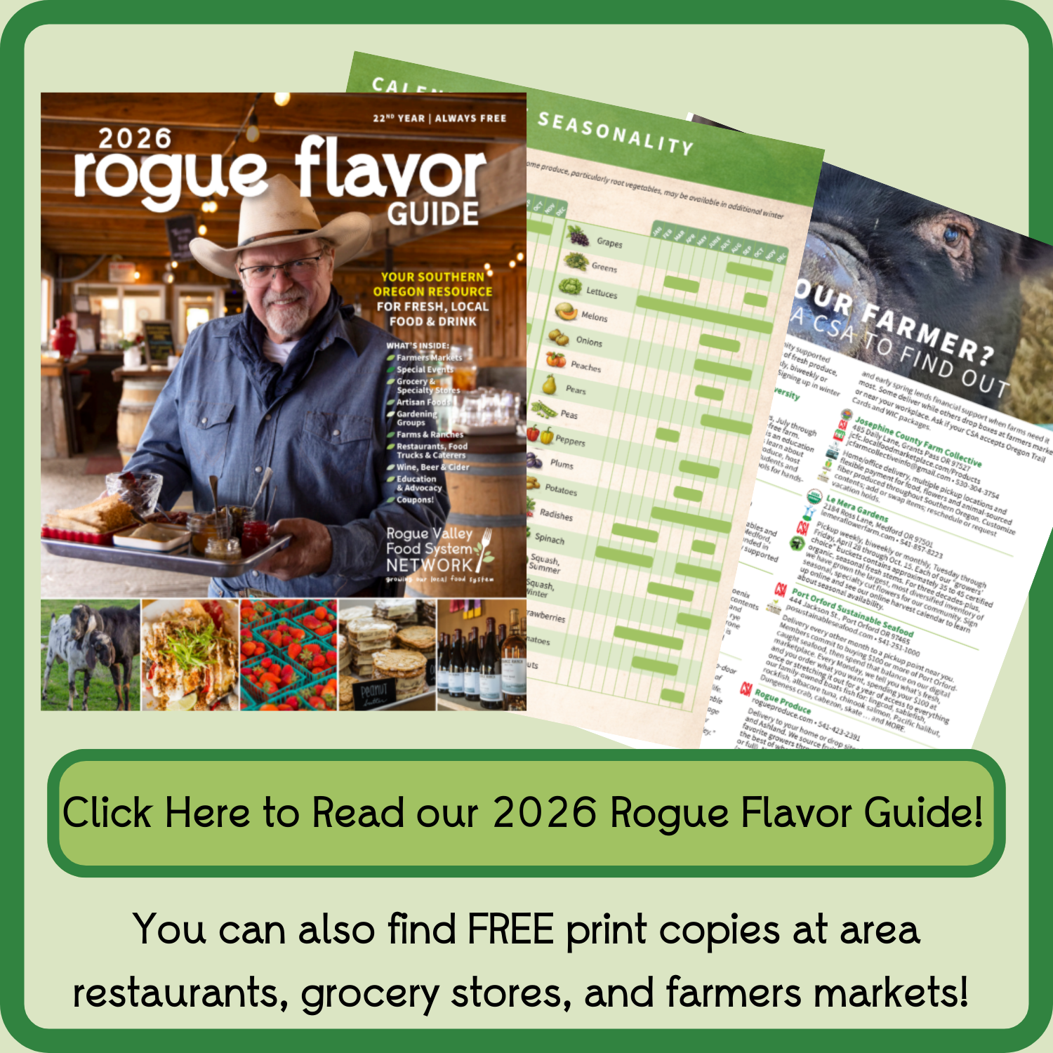 You can find the 2026 Rogue Flavor Guide at restaurants, grocery stores, and farmers markets across the Rogue and Illinois Valleys—pick one up and dig in!
